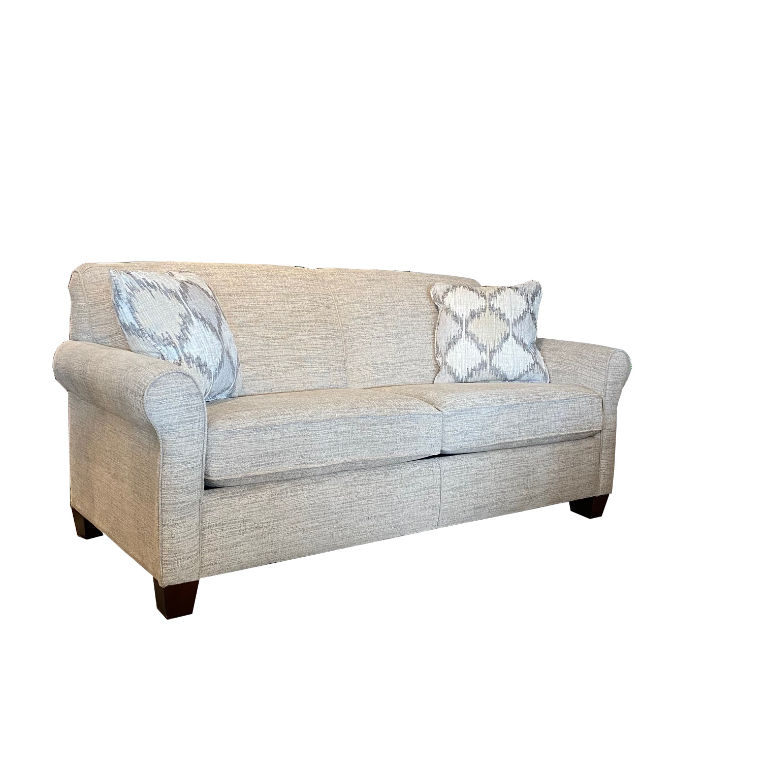 Angie Full Sleeper features P-shaped roll arm and exposed wood legs. Custom Comfort Premium Innerspring mattress is standard.Read More