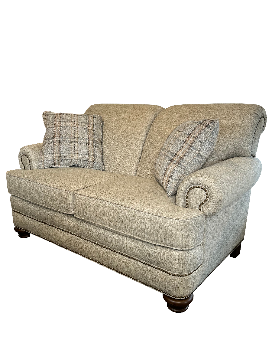 Reed Loveseat features scroll back, rolled arms, nailhead trim and turned bun legs.Read More