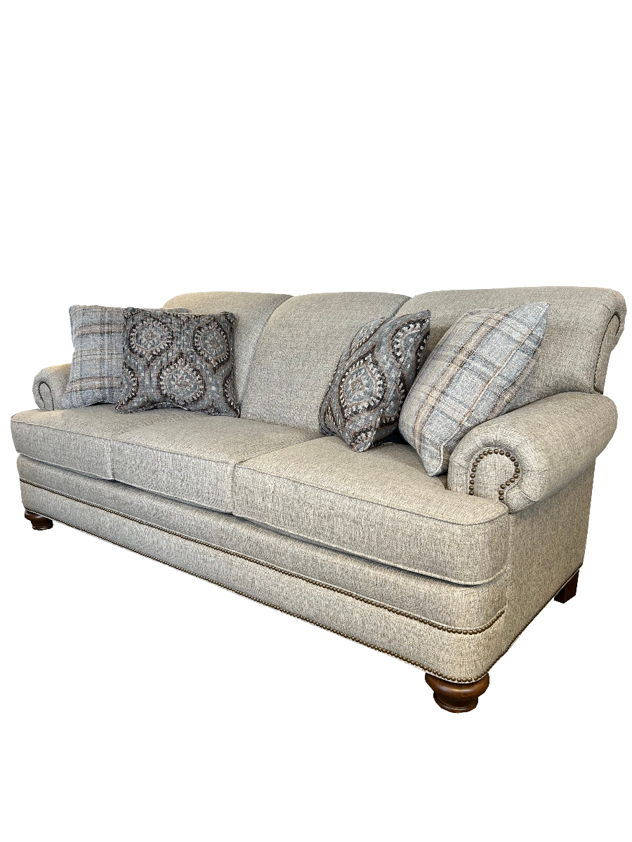 Satisfy your classic taste with our charming Reed collection. With its tight scroll back, rolled arm, turned bun leg, and bided front rail, you've got the makins of a living room masterpiece. Add an optional antique brass nailhead trim for added flair. The Reed collection features a sofa, loveseat, chair, ottoman, and sectional.