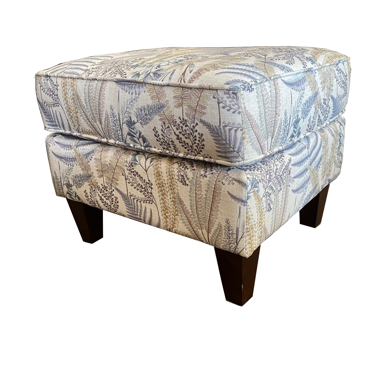 Loren Ottoman accent silhouette features tapered wooden legs and plush seat cushions. The collection includes a swivel chair, stationary chair and ottoman. Take a look at Louis to see this silhouette in leather.