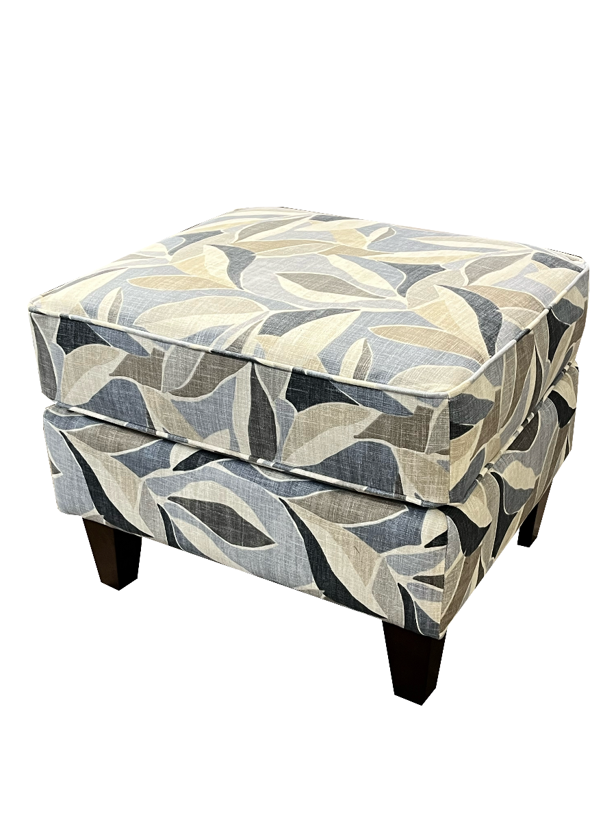 Loren Ottoman accent silhouette features tapered wooden legs and plush seat cushions. The collection includes a swivel chair, stationary chair and ottoman. Take a look at Louis to see this silhouette in leather.