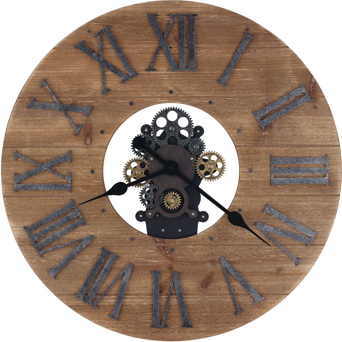 This oversized gallery wall clock's prominent features are the natural wood finish background, extra-large Roman numerals, and the unique arrangement of gears in the center of the clock that are suspended in a central opening. This clock is perfect for those hoping to add warmth to their space with a unique and highly versatile piece.Read More