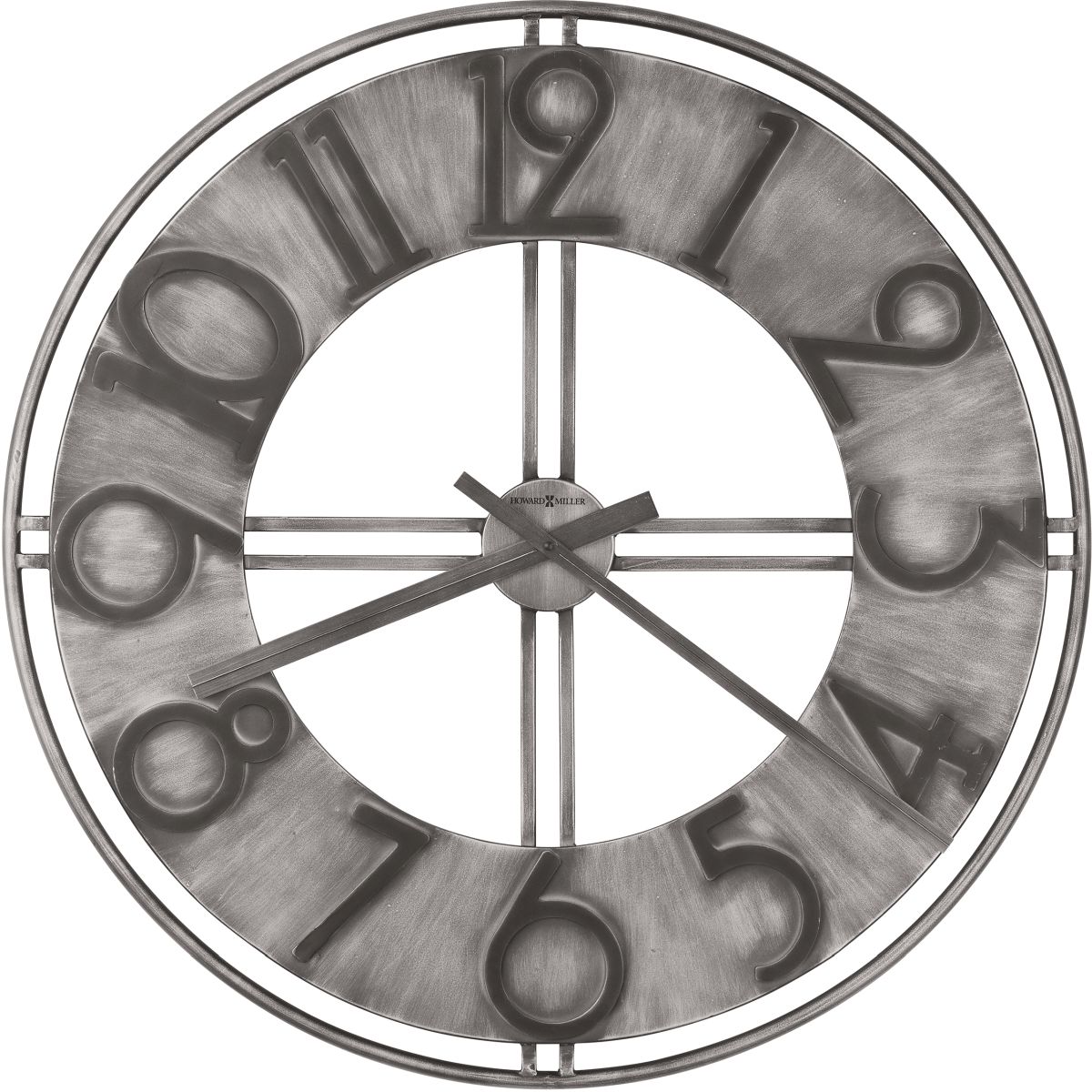 This 30" wrought-iron wall clock comes with a brushed aged silver finish. Two parallel lines connect the outer ring to the center at the 12, 3, 6, and 9 positions. The thick, numeral ring creates an interesting texture with a visible brushed effect.
