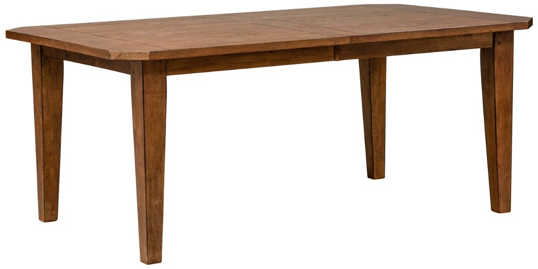 Gather around the Hearthstone Ridge rectangular leg table. Crafted of rubberwood solids and oak veneers, this piece features a rustic oak finish, two 18” removable leaves to accommodate guests or a larger family, planked top, canted corners, wood and peg accents, and is anchored by tapered legs.Read More