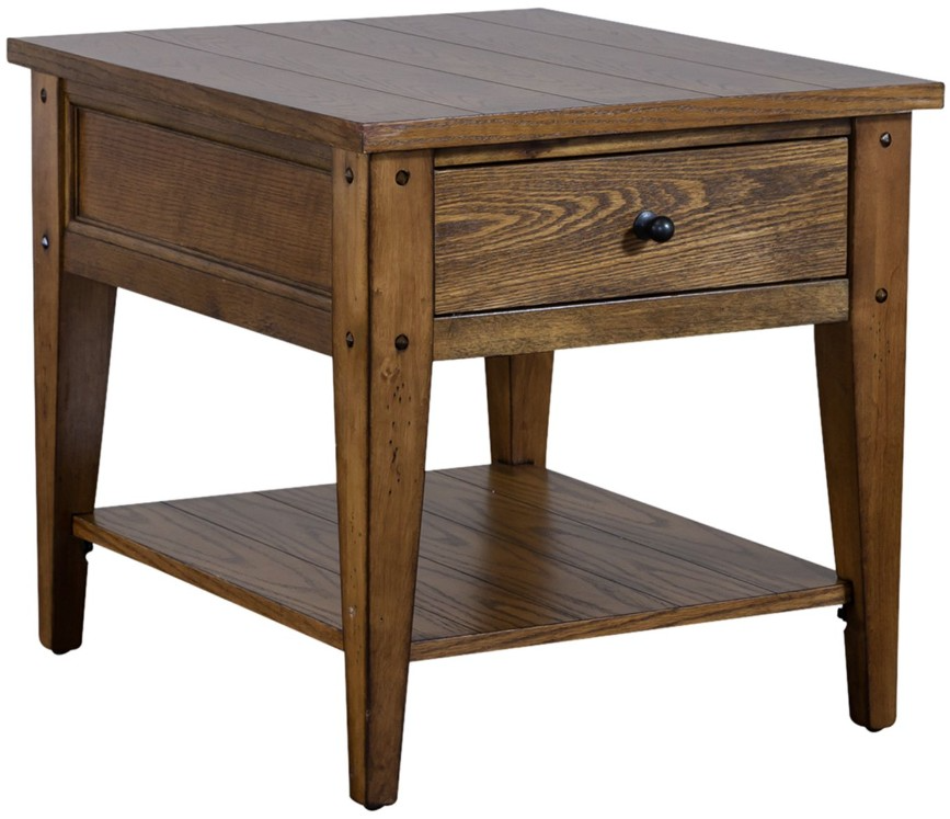 Enhance your space with the casual country style Lake House end table. Crafted of poplar solids and oak veneers, this piece features an oak finish, appealing planked top, one planked bottom shelf, one drawer for additional storage, simplistic wood and peg accents, antiqued brass knob hardware, anchored by a tapered leg design.Read More