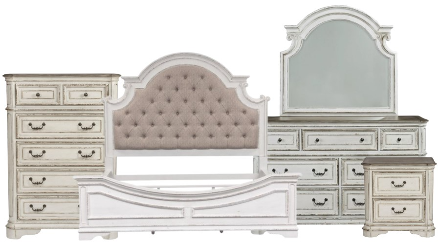 Opt for an elegant display. A refined yet relaxed feel describes the Magnolia Manor queen upholstered bed, dresser, mirror, chest, and nightstand. Crafted of poplar solids with white oak and birch veneers, this kit features an antique white finish with heavy artistic chipping and weathered brown with whitewash tops.Read More