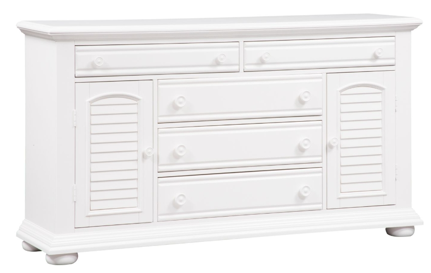 Obtain a fashionable cottage look with this 2 door 5 drawer dresser. The oyster white finish is accented by louvered panels and wooden knob hardware. Storage abounds with the 3 large fully stained drawers, 2 smaller flip down top drawers, and the adjustable shelf located behind each louvered door.Read More