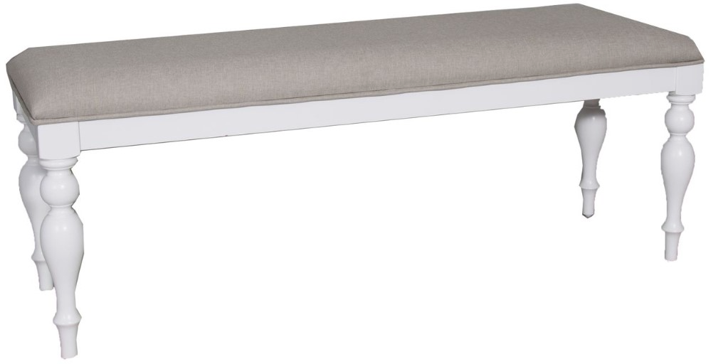 Sit in style and comfort with the Summer House bench. Crafted of poplar and rubberwood solids, this piece features an oyster white finish, linen upholstery, nylon chair glides to protect your flooring, and is anchored by beautifully round turned legs. This item has an alternate finish, sure to compliment any space effortlessly.Read More