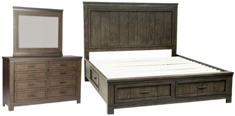 Enhance your home with the Thornwood Hills queen two-sided storage bed, dresser, and mirror. Crafted of rubberwood solids with mango veneers, this kit features a rock beaten grey finish with saw cuts, straight line cases with wide pilasters and block feet, metal strip accents, planked tops and side panels.Read More
