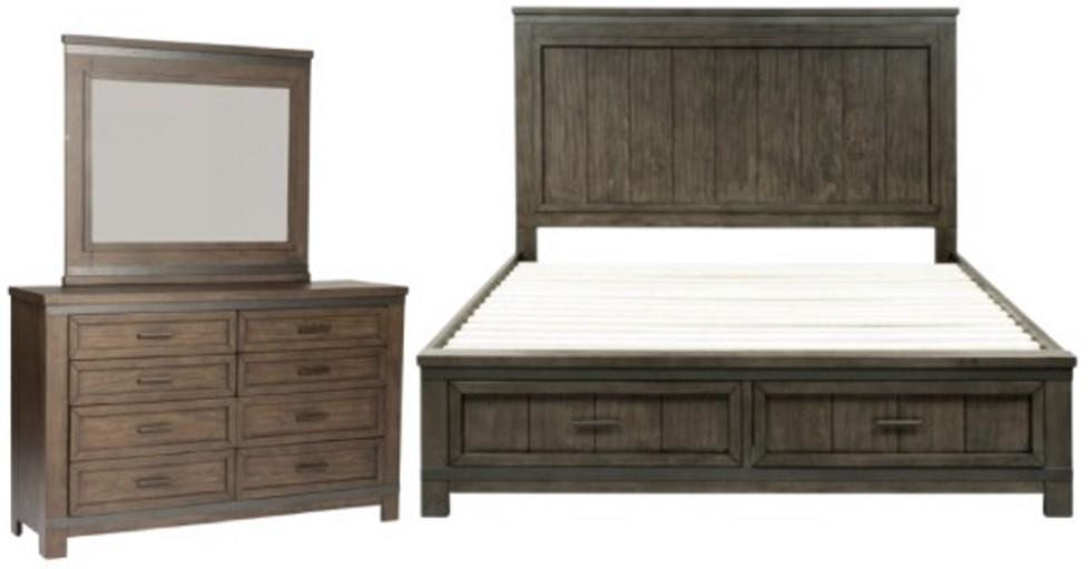 Elevate your home with the Thornwood Hills queen storage bed, dresser, and mirror. Crafted of rubberwood solids with mango veneers, this kit features a rock beaten grey finish with saw cuts, straight line cases with wide pilasters and block feet, metal strip accents, planked tops and side panels,Read More