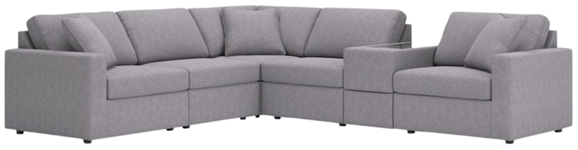 Includes 6 Modular Pieces: Left-arm facing corner chair, 2 armless chairs, console with storage, wedge and right-arm facing corner chair