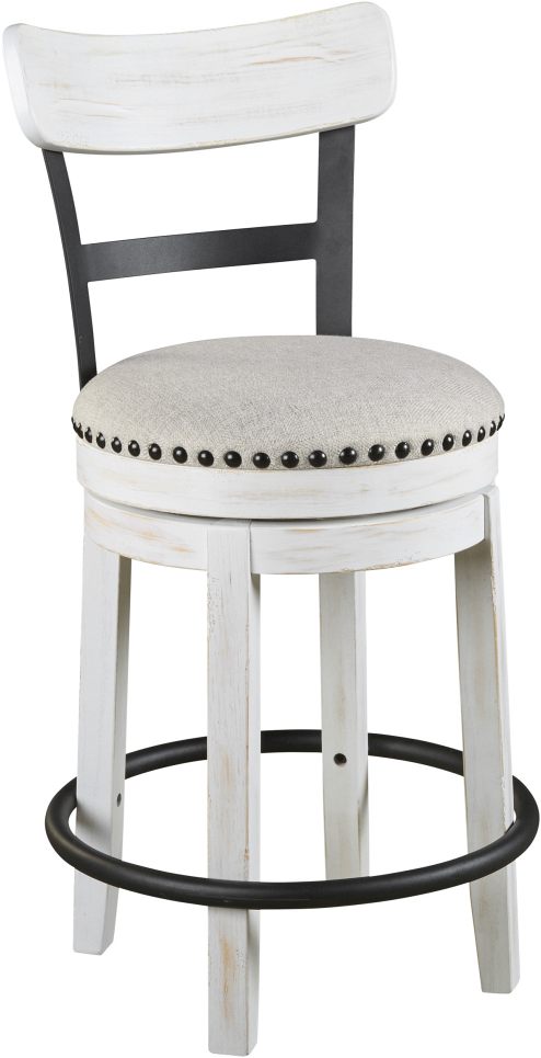 Dine in all-around comfort with the wrapping footrest and polyester upholstered cushioning of the Valebeck swivel barstool. With 360° of motion, its nailhead trimming and splayed metal back are ready to display.